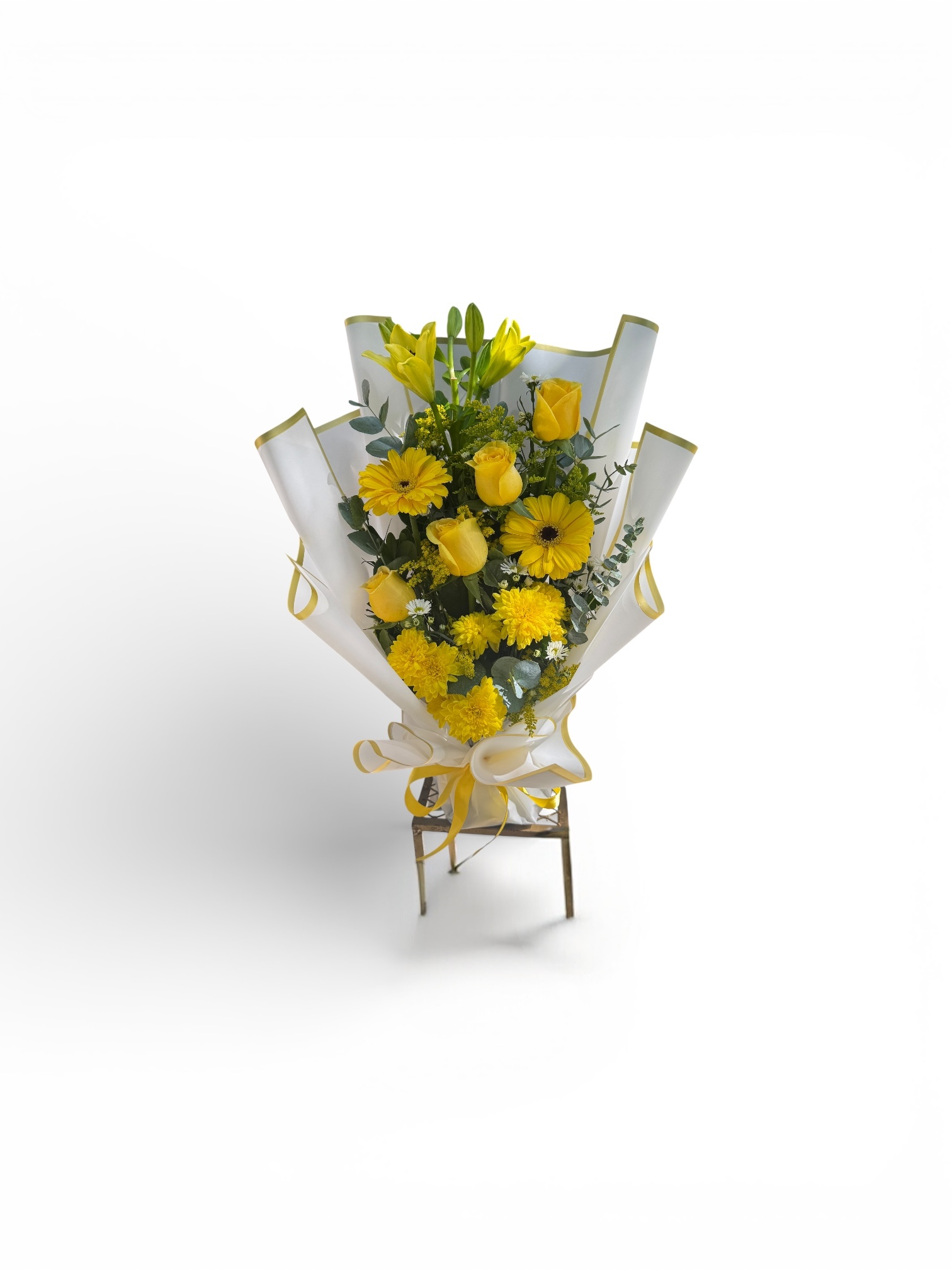 Vive la magia del Día de las Flores Amarillas con el arreglo Amanecer en Roma. 4 Rosas, 2 Gerberas, 1 Lilis y 3 Margaritas en tonos amarillos. Envoltura en papel coreano blanco. Entrega sin costo extra en Playa del Carmen. 🌼✨