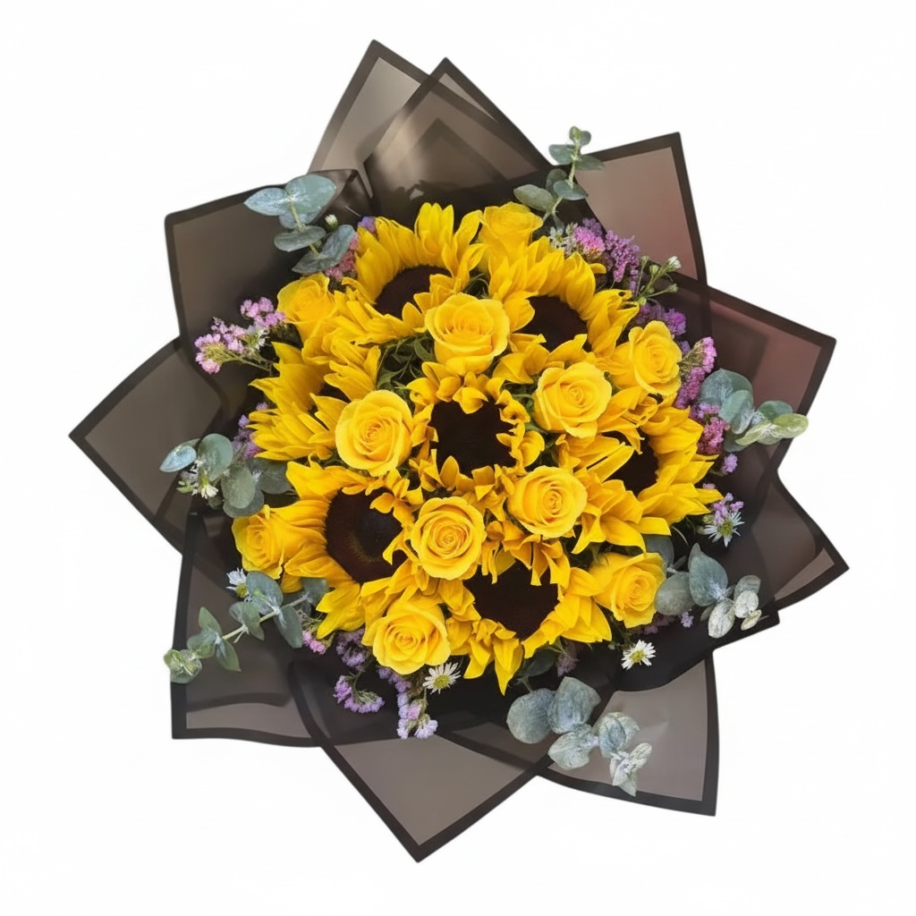 Ramo floral compuesto por 7 girasoles vibrantes y 12 rosas rojas, elegantemente envuelto en papel negro. Este ramo combina la calidez de los girasoles con la pasión de las rosas rojas, creando una opción perfecta para ocasiones especiales. Ideal para regalar o decorar con un toque de color y sofisticación.