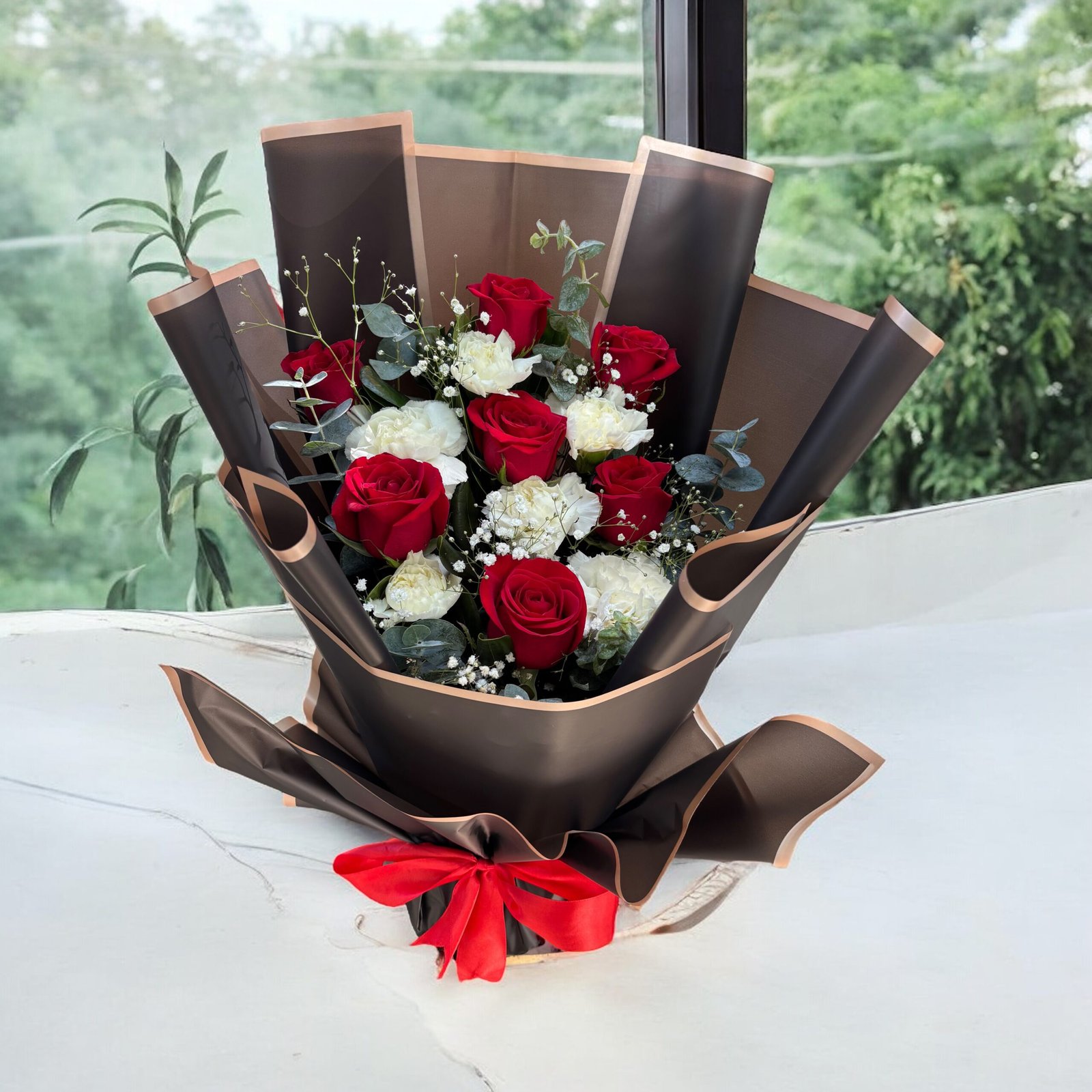 Hermoso arreglo floral en esponja con rosas rojas y claveles blancos, cuidadosamente envuelto en elegante papel negro. Ideal para expresar amor, romance y elegancia en aniversarios, cumpleaños o momentos especiales. 🌹✨