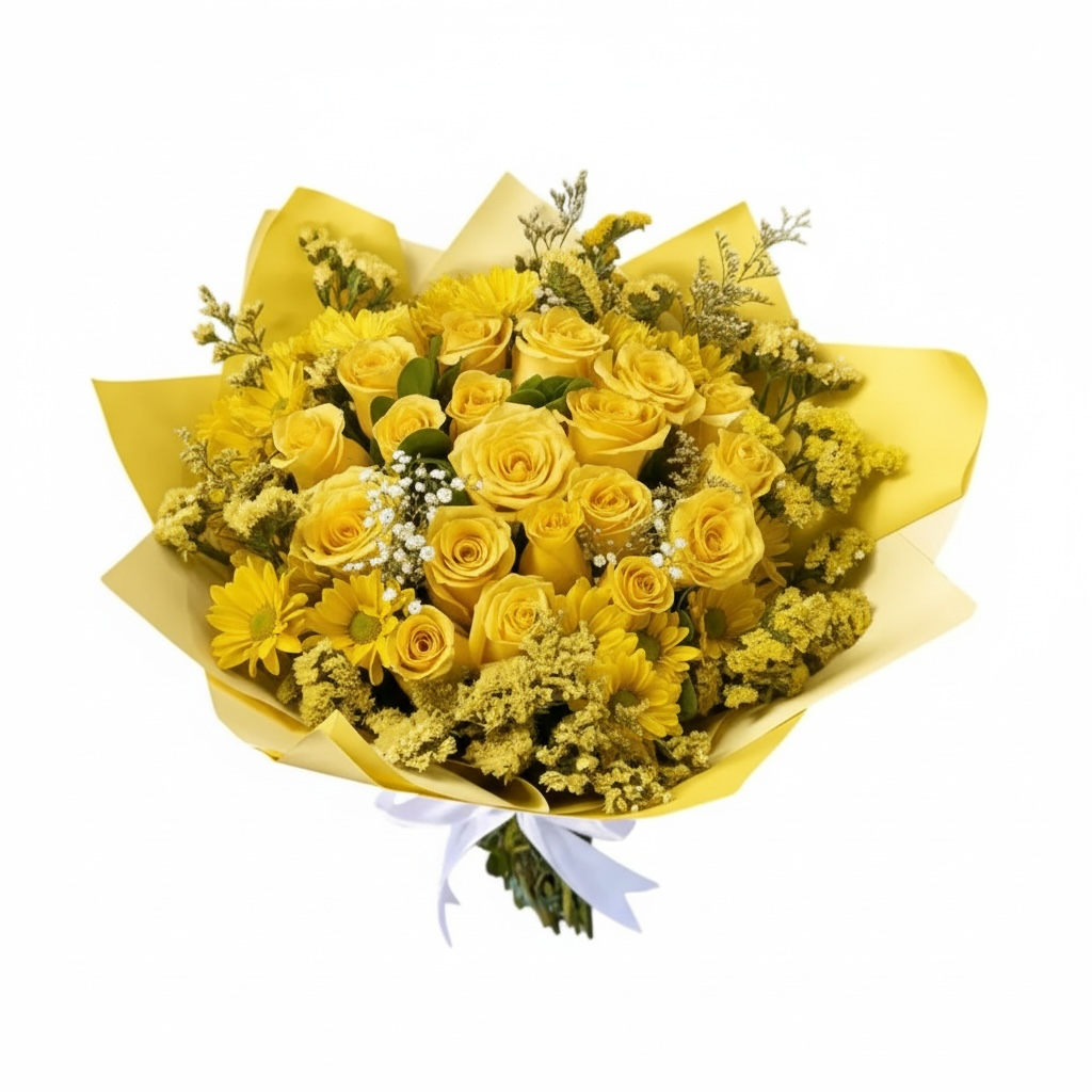 Ramo floral de 18 rosas rosadas, margaritas y siempre vivas. Celebra cumpleaños, aniversarios y más con este hermoso ramo.