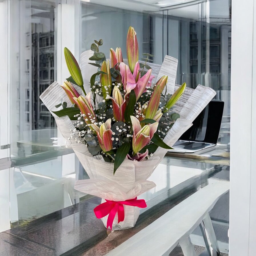 Arreglo de vibrantes lirios Acapulco con eucalipto y baby's breath, conservado en esponja floral y envuelto en papel coreano para una presentación minimalista y elegante.