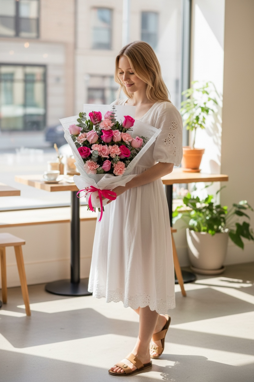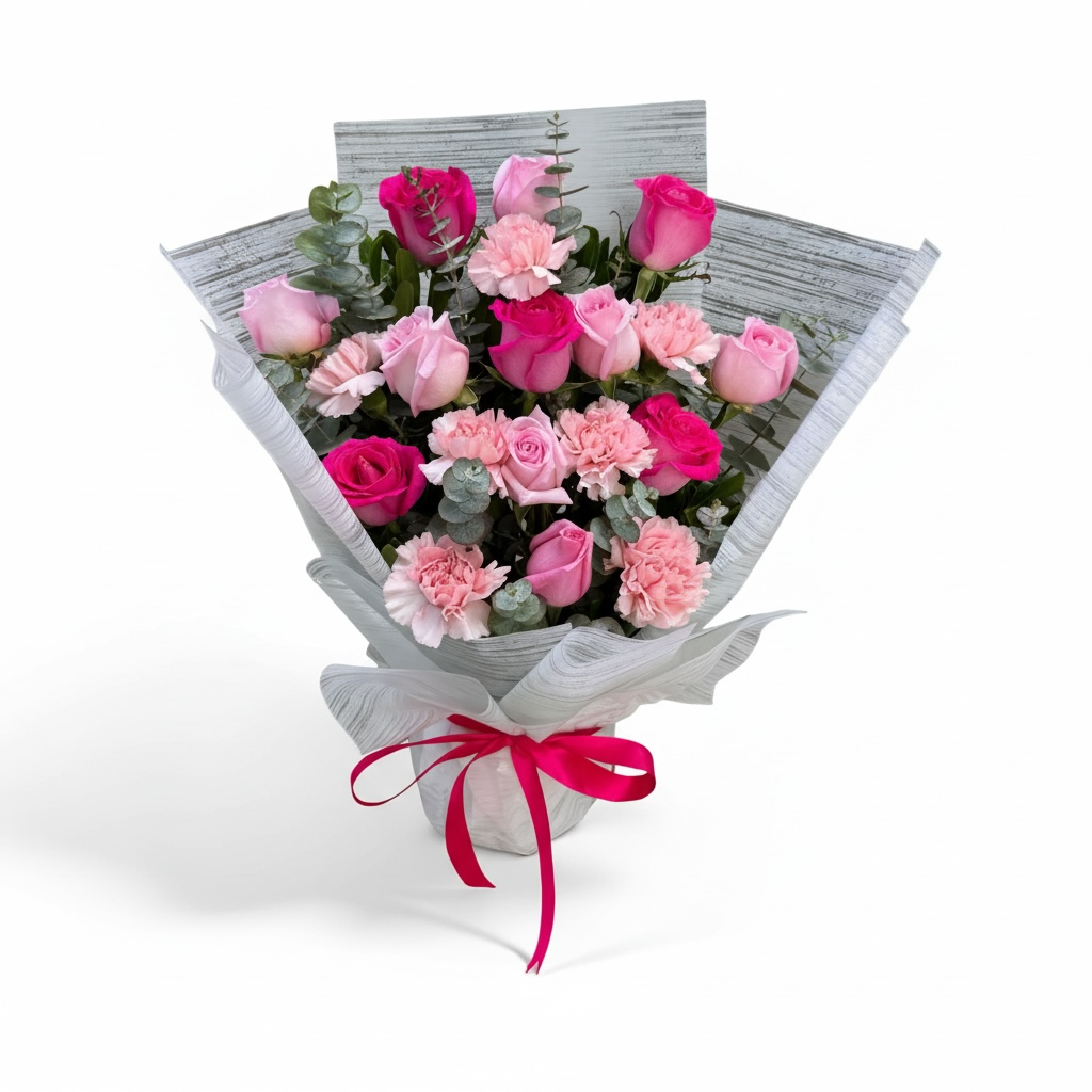 Ramo coreano de rosas fucsia y claveles rosados. Un estallido de dulzura y energía moderna. Perfecto para regalar un mensaje de amor apasionado y cariño tierno. Envío a domicilio con estilo minimalista y elegante.