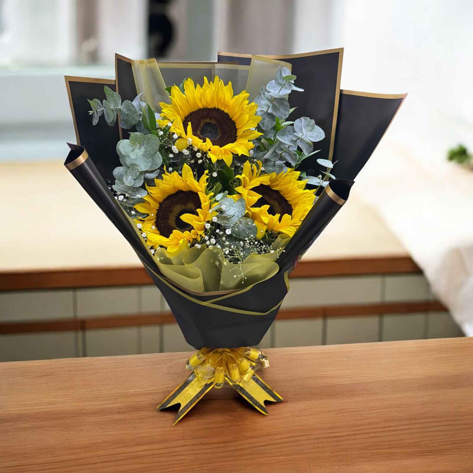 Arreglo floral serio y moderno con girasoles y papel coreano negro. Perfecto para aniversario, graduación o como detalle de agradecimiento profesional. Un regalo impactante y sofisticado.